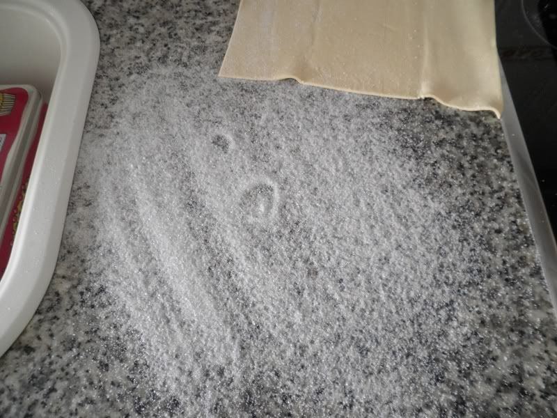 Una vez la placa está descongelada, esparciremos una suave capa de azúcar sobre la zona de trabajo. Aunque va al gusto, aconsejo no abusar. El hojaldre es insulso de por sí, pero le vamos a meter un relleno de nocilla. Si os pasáis con el azúcar luego no me vengáis con denuncias por inducción a la diabetes.