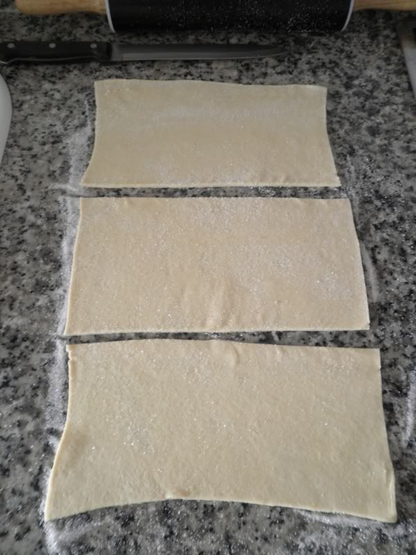 A continuación decidiremos el tamaño y la forma de las napolitanas. ¿Gruesas y corticas? ¿Largas y delgadas? ¿Un palmo de largas y cuatro dedos de anchas? ¿Infinitesimales? Yo opto por hacer tres napolitanas por placas, así que corto la placa en tres partes: pongo la placa en horizontal (panorámico, 16:9, como queráis verlo) y hago dos cortes verticales. Eso me deja tres porciones bastante generosas en anchura, ideal para manipular y para llenar sin preocuparse.