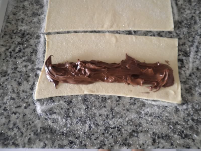 A mí me gusta dejar un margen entre la tira de nocilla y el relleno, para así poder dejar una tira de masa para hacer el sellado lateral con comodidad.
