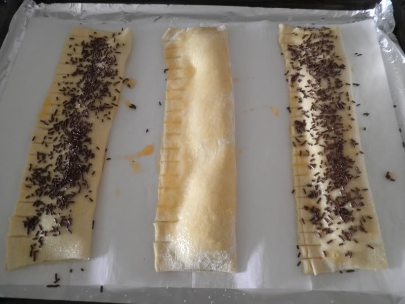 Al terminar, procedemos a tirarle fideos de chocolate al gusto del consumidor por encima. Entre el huevo y el azúcar los fideos se quedarán pegados a la napolitana, y con el huevo la napolitana tendrá un aspecto brillante y espectacular. (Mientras no se nos fundan demasiado los fideos.... ¬¬U)